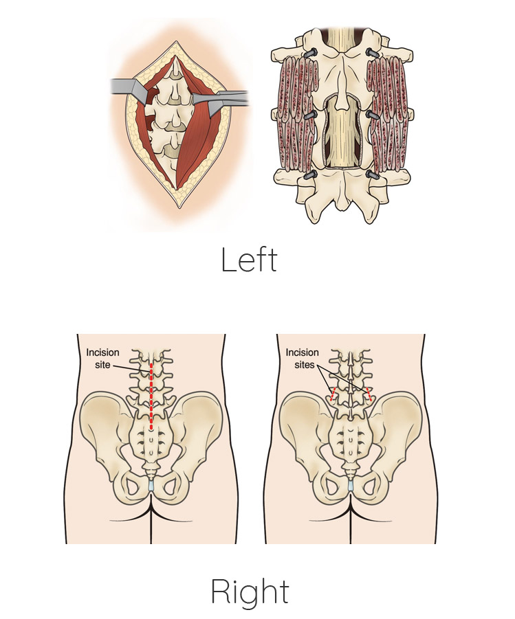 (Left) The incision site in the lower back that is used for some traditional open spine surgeries. (Right)The minimally invasive incisions typically used for a lumbar spinal fusion. Both the decompression and the placing of screws and rods are accomplished through these small incisions.