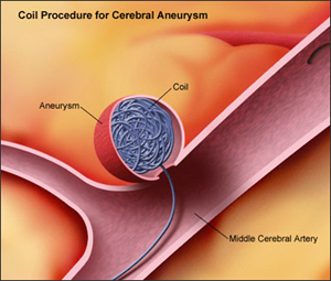 B) Endovascular Coiling: A surgeon inserts a very thin metal wire that forms a coil inside a brain aneurysm to block blood flow. A brain aneurysm is a bulging, weakened area in the wall of an artery in the brain. This results in an abnormal widening or ballooning. Because the artery wall has a weakened spot, the aneurysm is at risk for bursting if blood flow isn’t blocked. Aneurysm can be treated by coiling or clipping it closed.